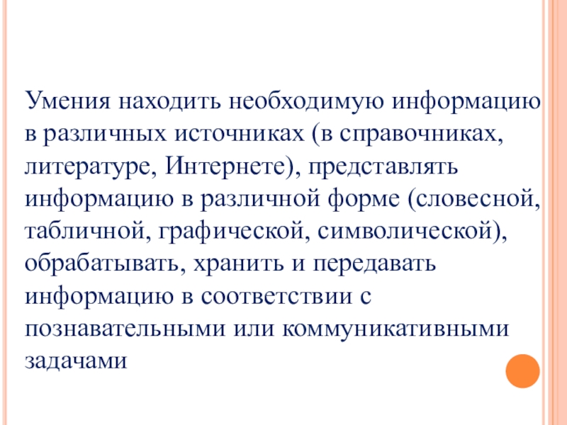 представлять информацию в различной форме (словесной, табличной, графической, символической), обрабатывать, хранить и передавать информацию в соответствии с познавательными или коммуникативными задачами