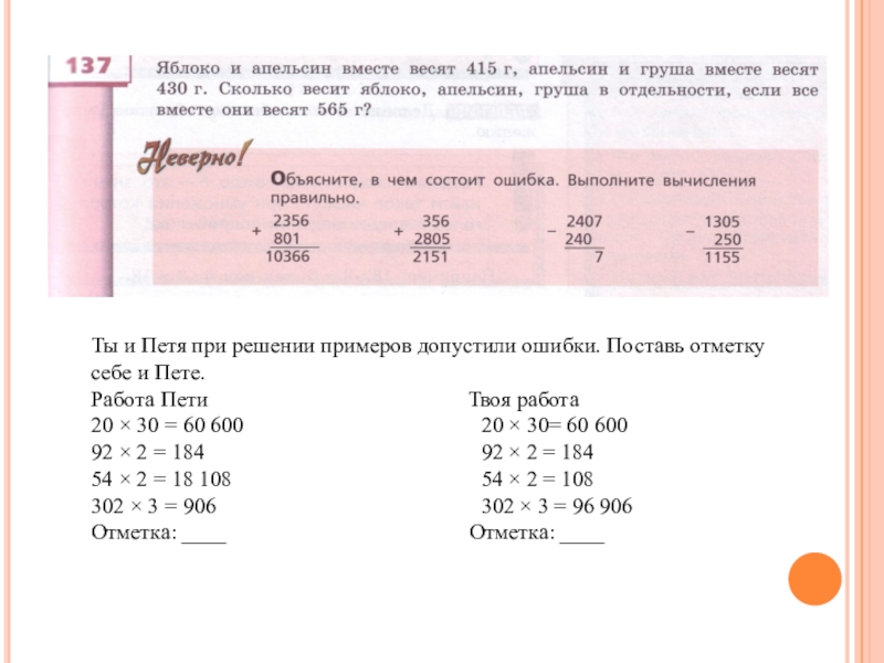 Слайд 7Ты и Петя при решении примеров допустили ошибки. Поставь отметку себе