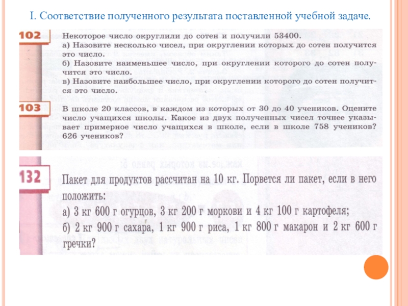 Слайд 2I. Соответствие полученного результата поставленной учебной задаче.