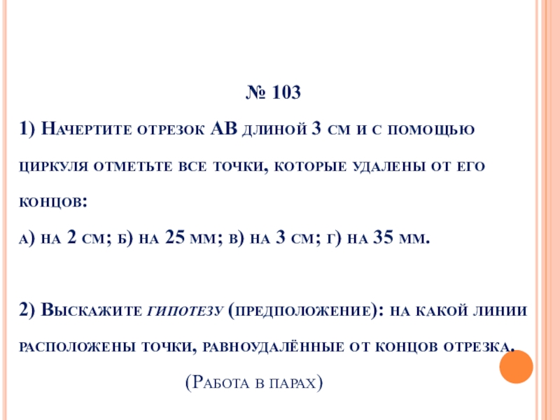 2) Выскажите гипотезу (предположение): на какой линии расположены точки, равноудалённые от концов отрезка.