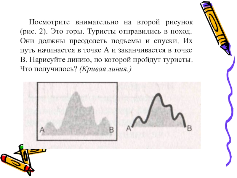 в поход. Они должны преодолеть подъемы и спуски. Их путь начинается в точке А и заканчивается в точке В. Нарисуйте линию, по которой пройдут туристы. Что получилось? (Кривая линия.)