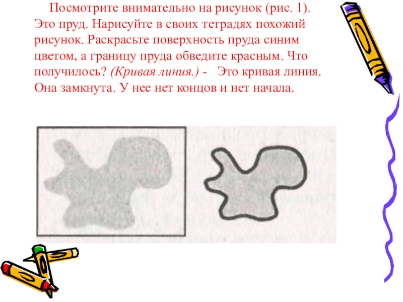 Слайд 5Посмотрите внимательно на рисунок (рис. 1). Это пруд. Нарисуйте в своих