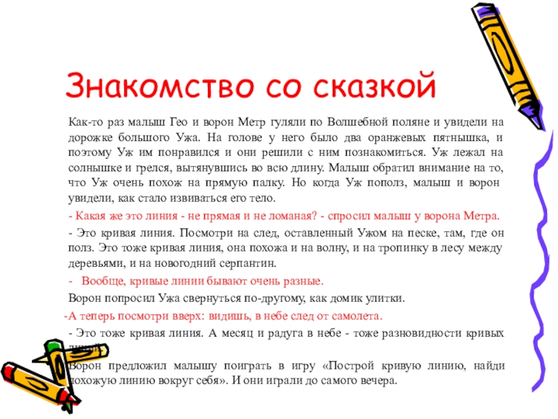 - Какая же это линия - не прямая и не ломаная? - спросил малыш у ворона Метра.