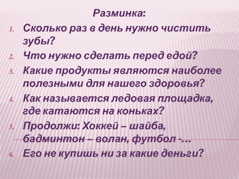 Разминка:Сколько раз в день нужно чистить зубы?Что нужно сделать перед едой?Какие продукты являются наиболее полезными для нашего здоровья?Как называется ледовая площадка, где катаются на коньках?Продолжи: Хоккей – шайба, бадминтон – волан, футбол -…Его не купишь ни