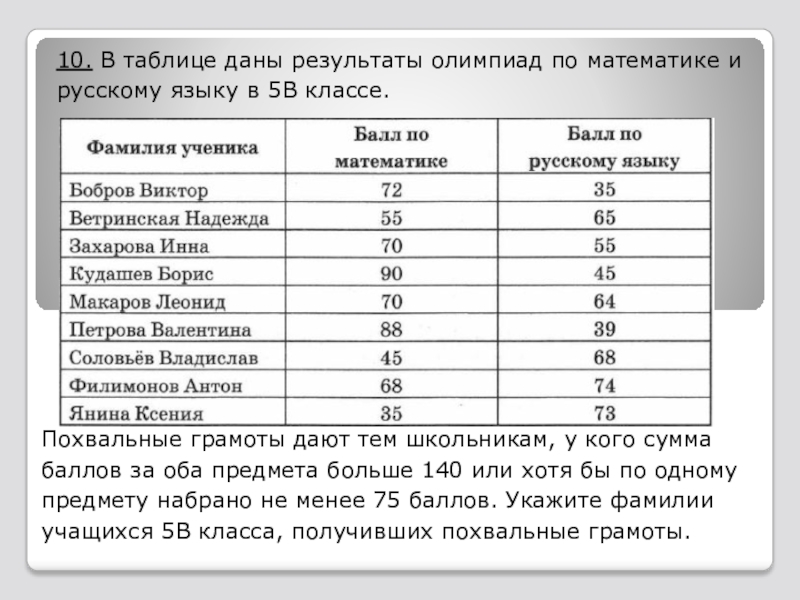 Похвальные грамоты дают тем школьникам, у кого сумма баллов за оба предмета больше 140 или хотя бы по одному предмету набрано не менее 75 баллов. Укажите фамилии учащихся 5В класса, получивших похвальные грамоты.