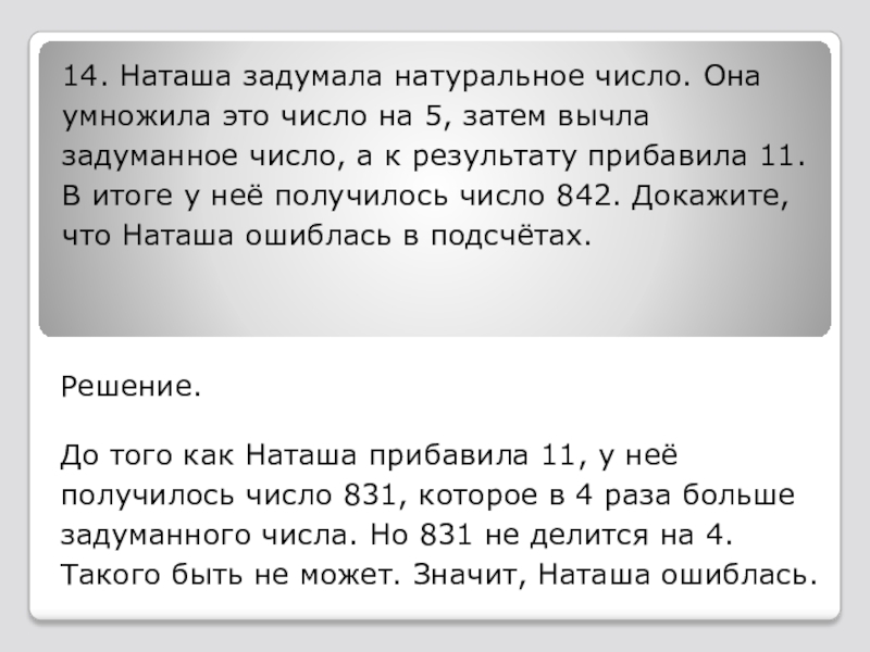 До того как Наташа прибавила 11, у неё получилось число 831, которое в 4 раза больше задуманного числа. Но 831 не делится на 4. Такого быть не может. Значит, Наташа ошиблась.