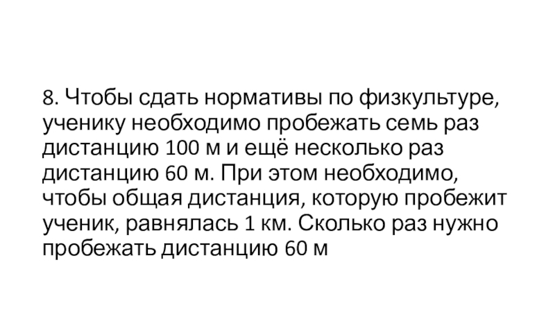 8. Чтобы сдать нормативы по физкультуре, ученику необходимо пробежать семь раз дистанцию 100 м и ещё несколько