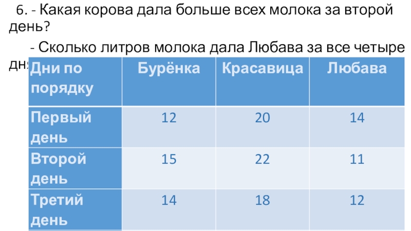 6. - Какая корова дала больше всех молока за второй день?    - Сколько