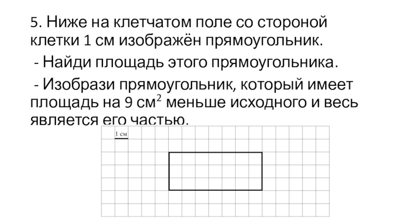 5. Ниже на клетчатом поле со стороной клетки 1 см изображён прямоугольник.  - Найди площадь этого