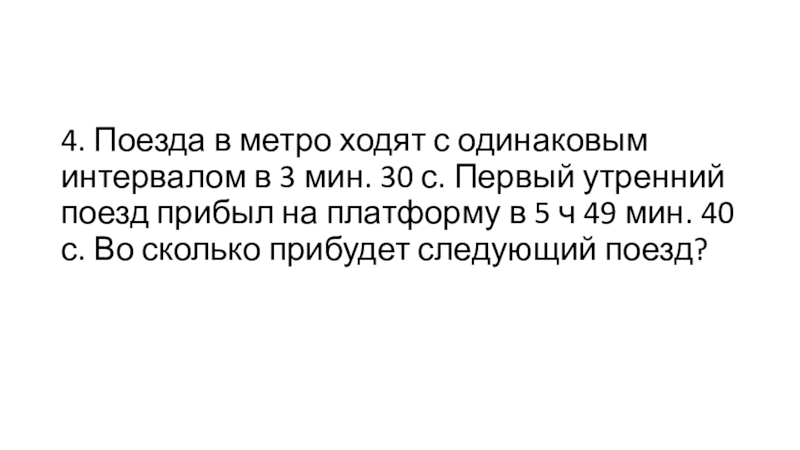 4. Поезда в метро ходят с одинаковым интервалом в 3 мин. 30 с. Первый утренний поезд прибыл