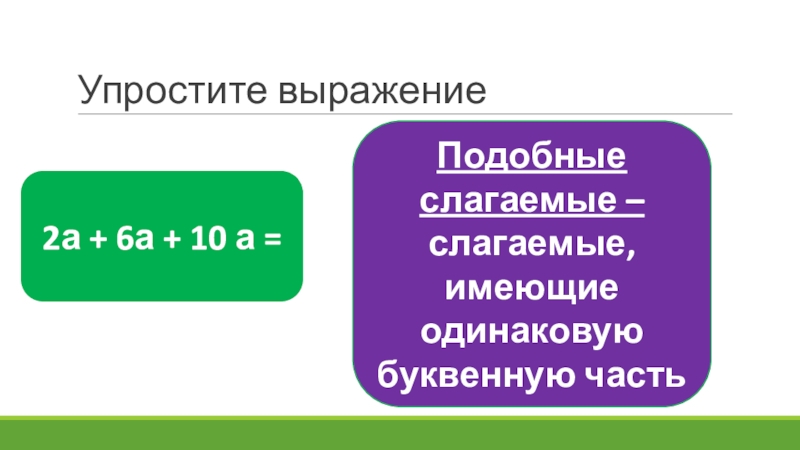 Упростите выражение2а + 6а + 10 а =Подобные слагаемые – слагаемые, имеющие одинаковую буквенную часть