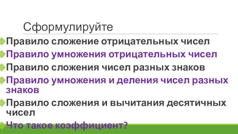 СформулируйтеПравило сложение отрицательных чиселПравило умножения отрицательных чиселПравило сложения чисел разных знаковПравило умножения и деления чисел разных знаковПравило