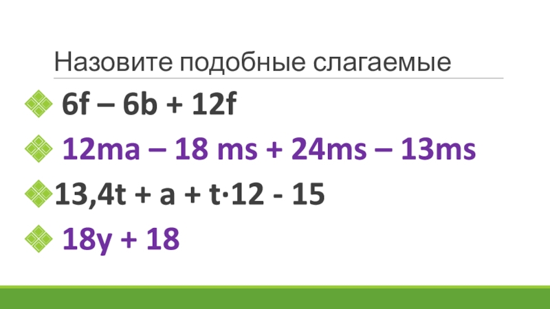 Назовите подобные слагаемые 6f – 6b + 12f 12ma – 18 ms + 24ms – 13ms13,4t +