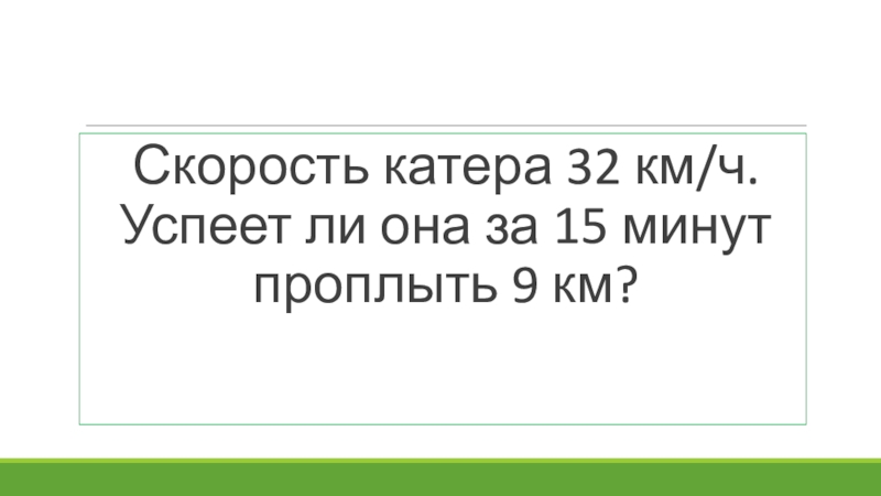 Слайд 9Скорость катера 32 км/ч. Успеет ли она за 15 минут проплыть