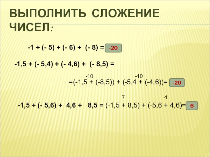 =(-1,5 + (-8,5)) + (-5,4 + (-4,6))=