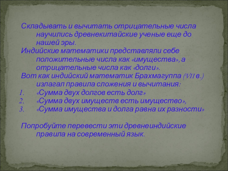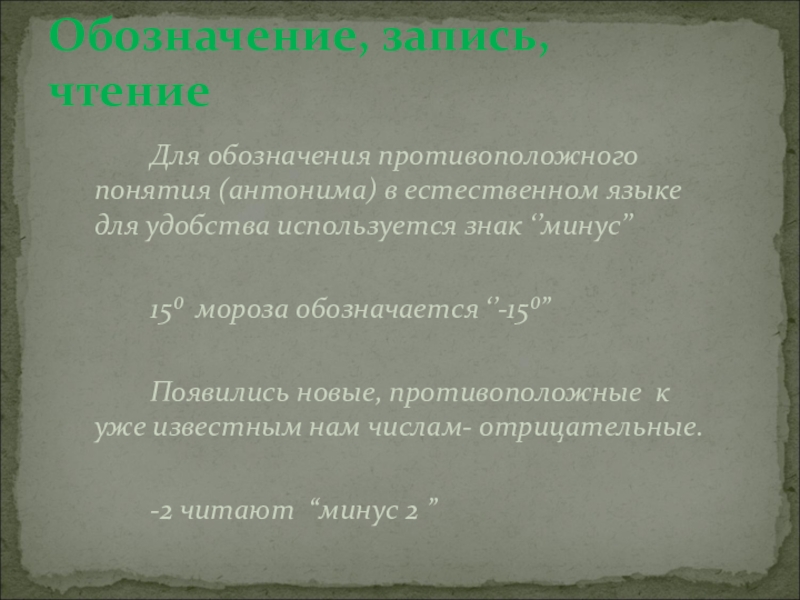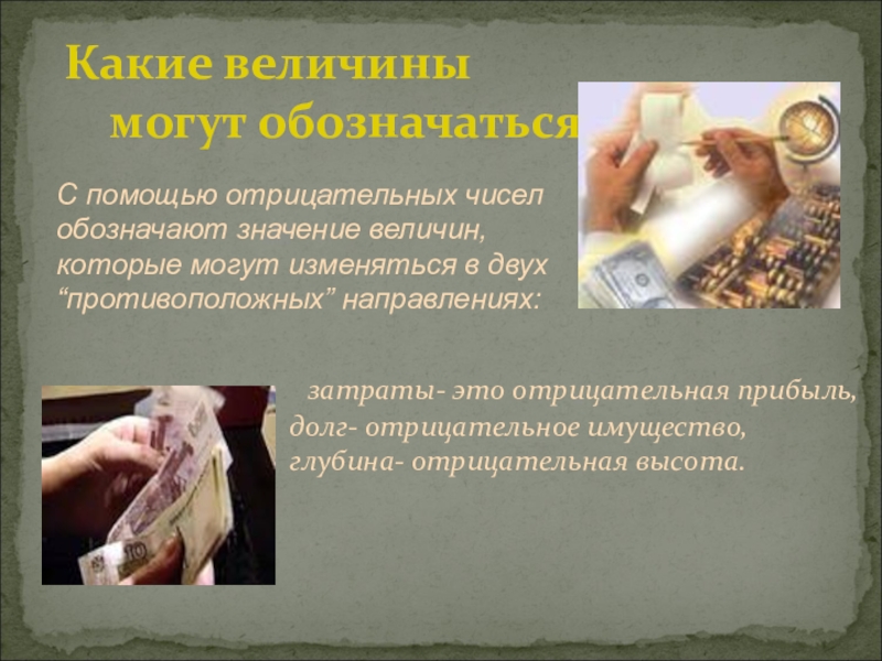 С помощью отрицательных чисел обозначают значение величин, которые могут изменяться в двух “противоположных” направлениях:
