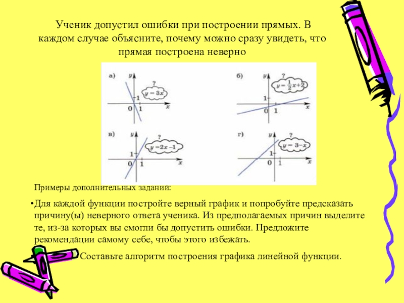 Для каждой функции постройте верный график и попробуйте предсказать причину(ы) неверного ответа ученика. Из предполагаемых причин выделите те, из-за которых вы смогли бы допустить ошибки. Предложите рекомендации самому себе, чтобы этого избежать.