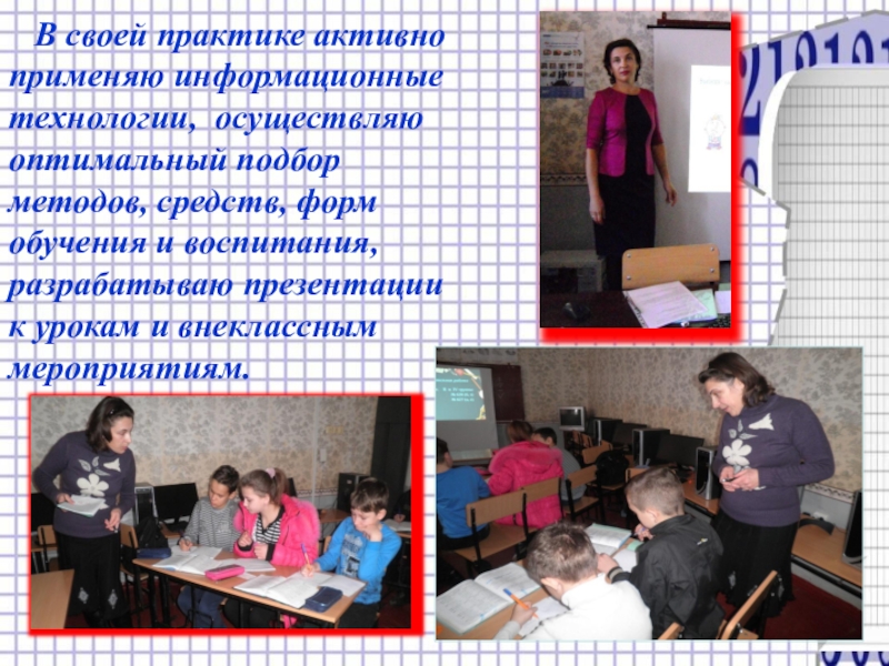 Слайд 4 В своей практике активно применяю информационные технологии,  осуществляю оптимальный