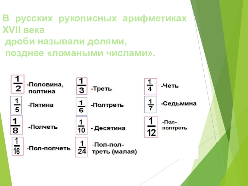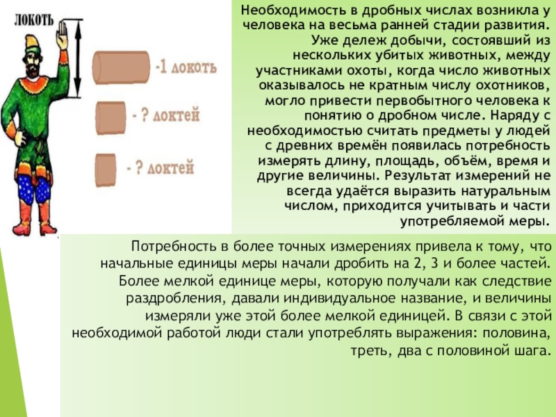 Потребность в более точных измерениях привела к тому, что начальные единицы меры начали дробить на 2, 3 и более частей. Более мелкой единице меры, которую получали как следствие раздробления, давали индивидуальное название, и величины измеряли уже этой более мелкой единицей. В связи с этой необходимой работой люди стали употреблять выражения: половина, треть, два с половиной шага.