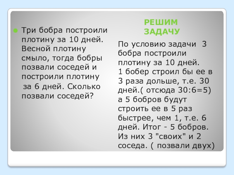 Три бобра построили плотину за 10 дней. Весной плотину смыло, тогда бобры позвали соседей и построили плотину