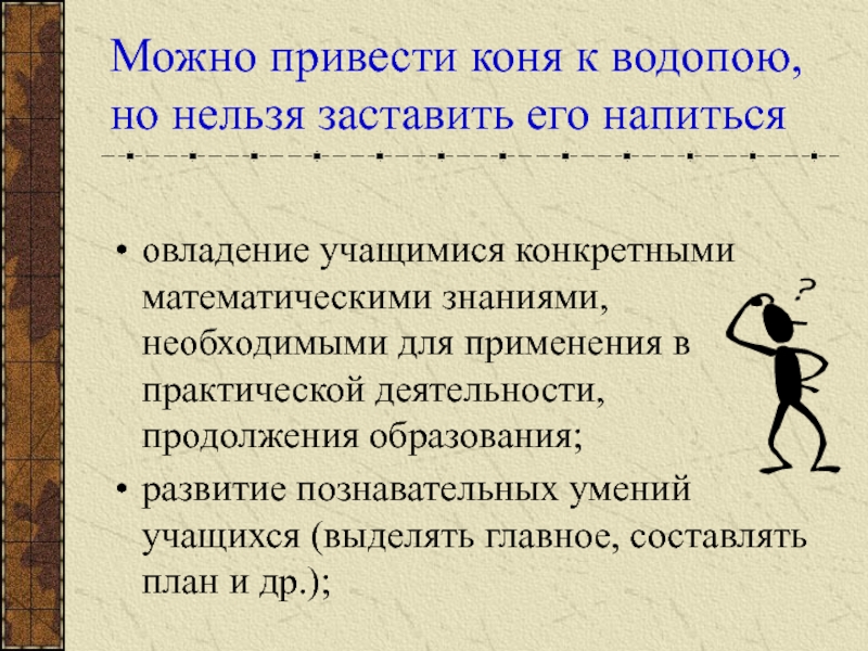 Можно привести коня к водопою, но нельзя заставить его напиться овладение учащимися конкретными математическими знаниями, необходимыми для применения
