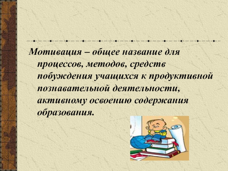 Мотивация – общее название для процессов, методов, средств побуждения учащихся к продуктивной познавательной деятельности, активному освоению содержания