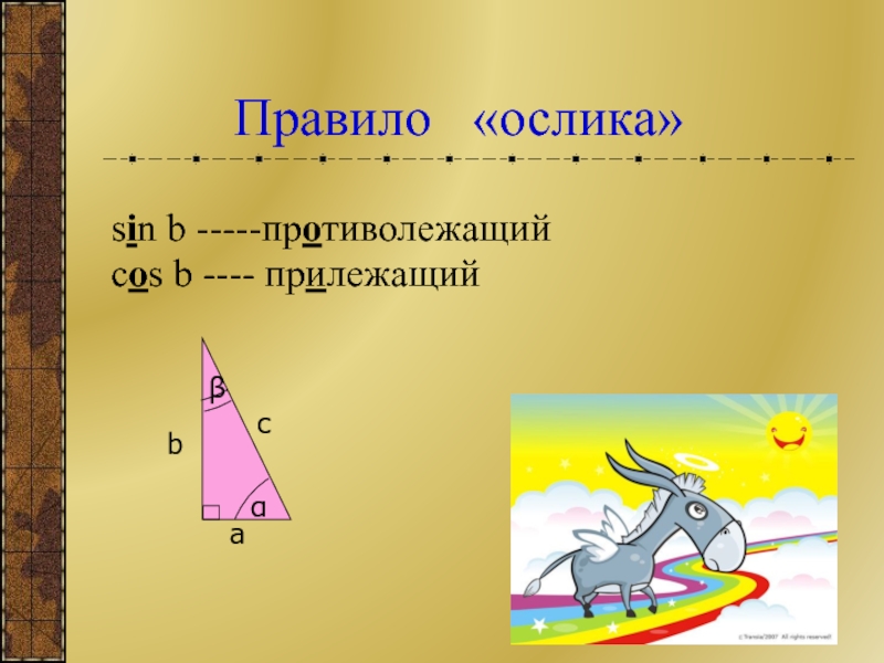 Правило  «ослика»  sin b -----противолежащийcos b ---- прилежащий