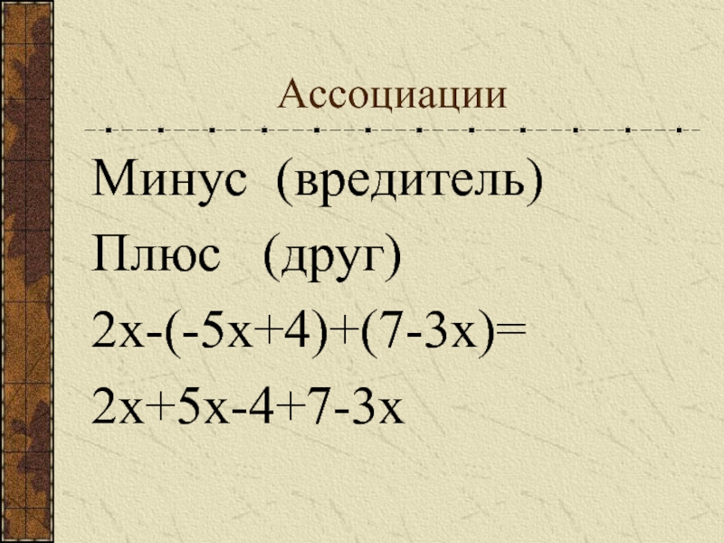 AссоциацииМинус (вредитель)Плюс  (друг)2х-(-5х+4)+(7-3х)=2х+5х-4+7-3х