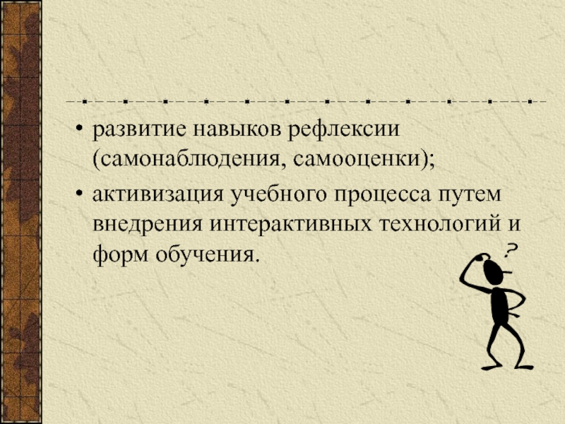 развитие навыков рефлексии (самонаблюдения, самооценки);активизация учебного процесса путем внедрения интерактивных технологий и форм обучения.