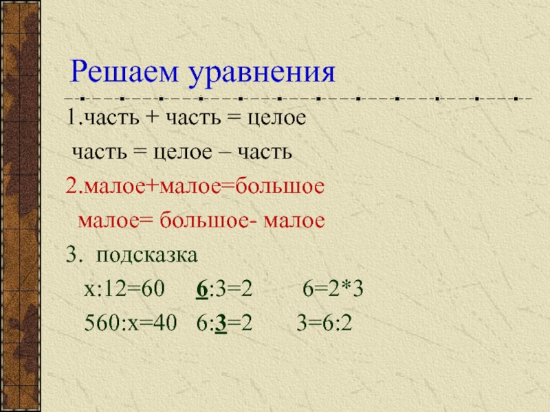 Решаем уравнения1.часть + часть = целое часть = целое – часть2.малое+малое=большое малое= большое- малое3. подсказка  х:12=60