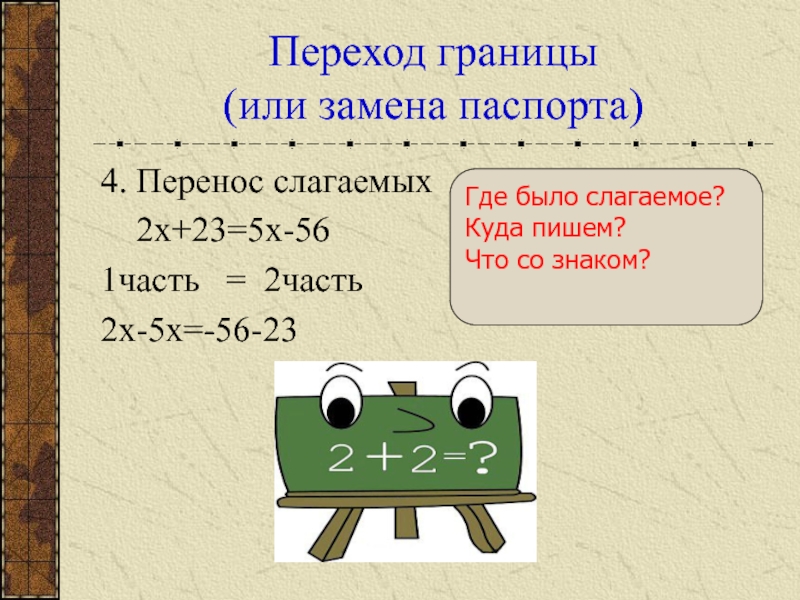 Переход границы (или замена паспорта)4. Перенос слагаемых  2х+23=5х-561часть  = 2часть2х-5х=-56-23Где было слагаемое?Куда пишем?Что со знаком?