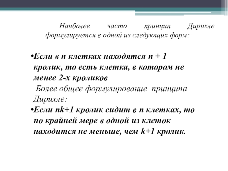 Наиболее часто принцип Дирихле формулируется в одной из следующих форм: