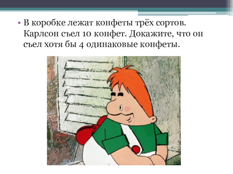 Слайд 9В коробке лежат конфеты трёх сортов. Карлсон съел 10 конфет. Докажите,
