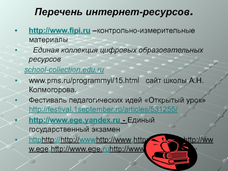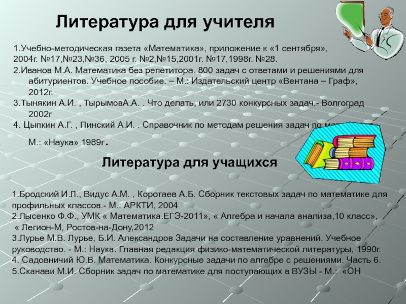 1.Бродский И.Л., Видус А.М. , Коротаев А.Б. Сборник текстовых задач по математике для профильных классов.- М.: АРКТИ, 2004