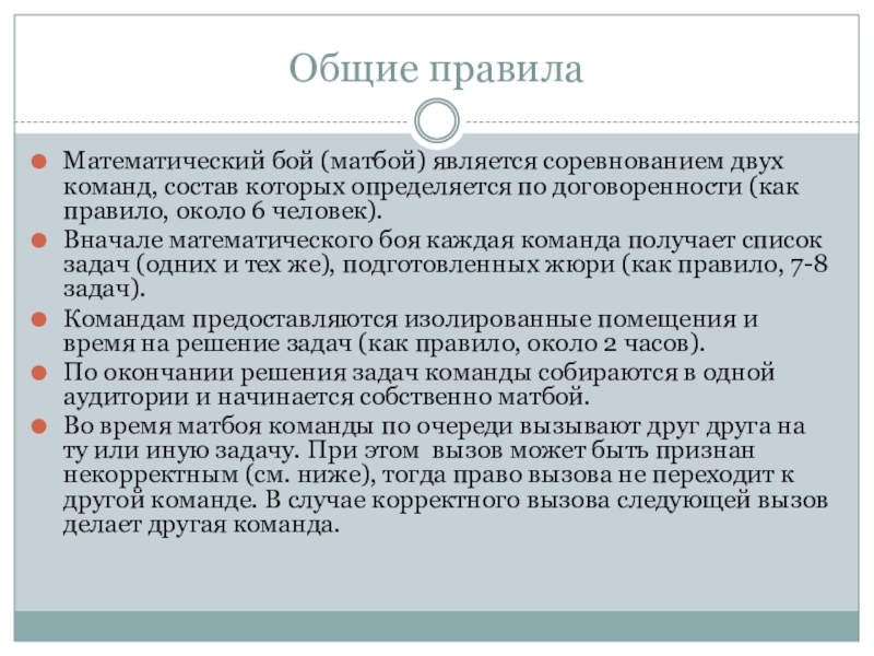 Математический бой (матбой) является соревнованием двух команд, состав которых определяется
