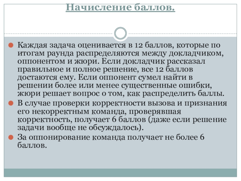 распределяются между докладчиком, оппонентом и жюри. Если докладчик рассказал правильное и полное решение, все 12 баллов достаются ему. Если оппонент сумел найти в решении более или менее существенные ошибки, жюри решает вопрос о том, как распределить баллы.
