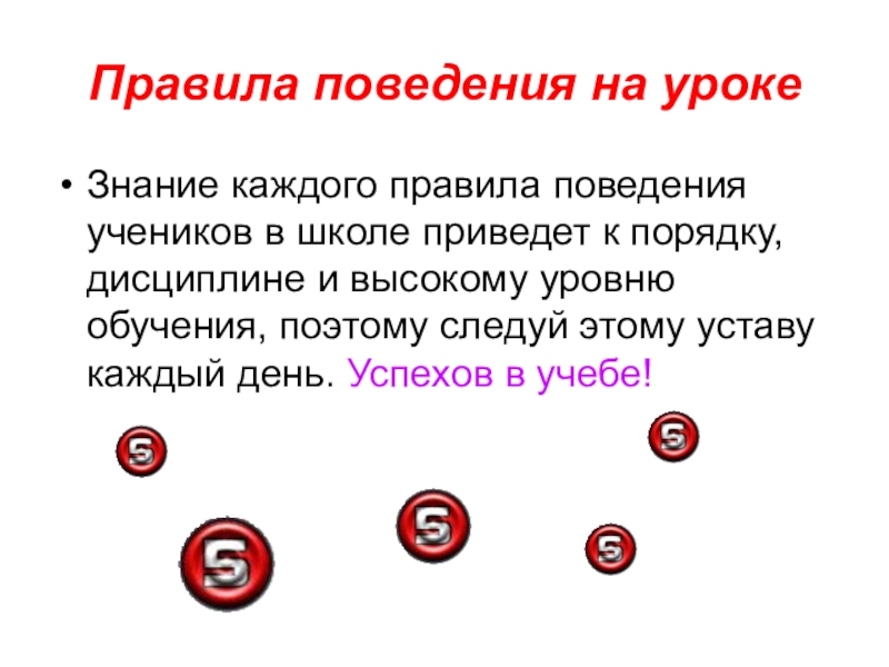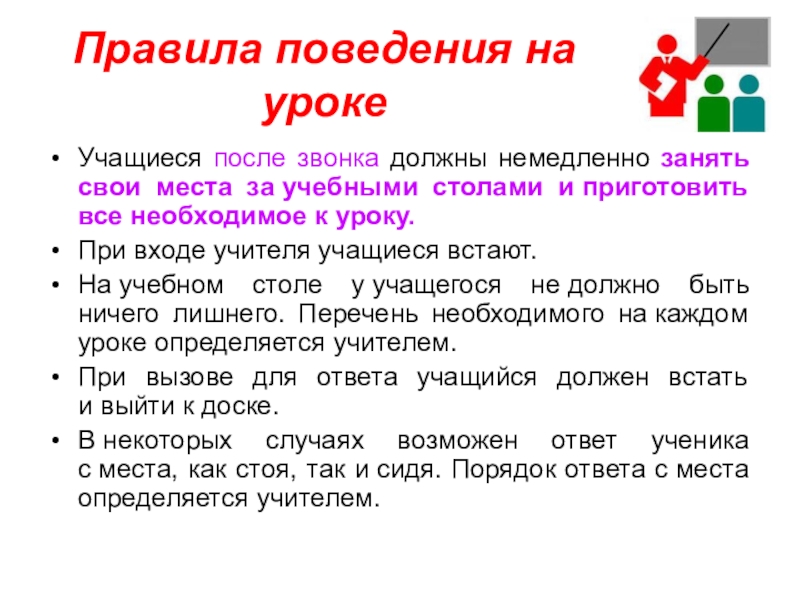 Поэтому, для того, чтобы обеспечить высокую эффективность урока, были составлены основные правила поведения учащихся на уроке, являющиеся частью общей культуры поведения в школе.