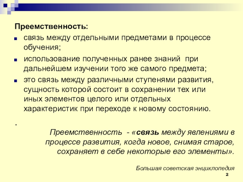 Преемственность - «связь между явлениями в процессе развития, когда новое, снимая старое, сохраняет в себе некоторые его элементы».