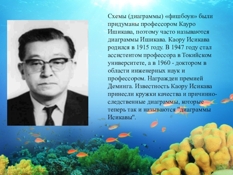 диаграммы Ишикава. Каору Исикава родился в 1915 году. В 1947 году стал ассистентом профессора в Токийском университете, а в 1960 - доктором в области инженерных наук и профессором. Награжден премией Деминга. Известность Каору Исикава принесли кружки качества и причинно-следственные диаграммы, которые теперь так и называются "диаграммы Исикавы".