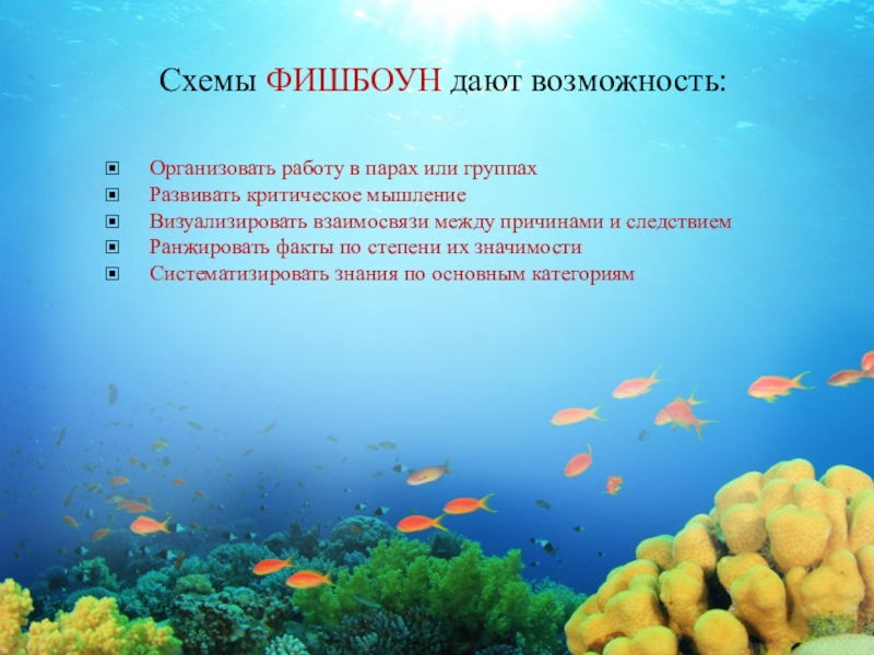 Слайд 16Схемы ФИШБОУН дают возможность: