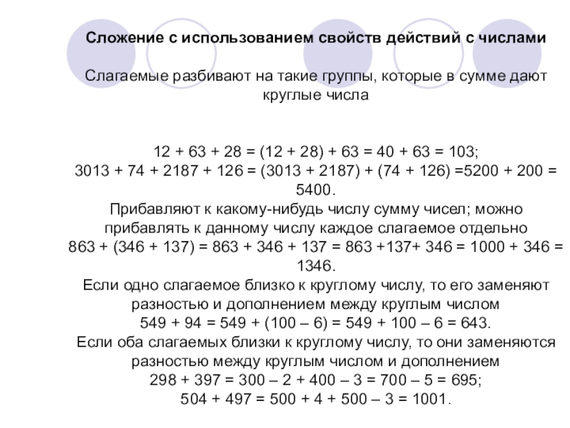Слайд 8Сложение с использованием свойств действий с числами