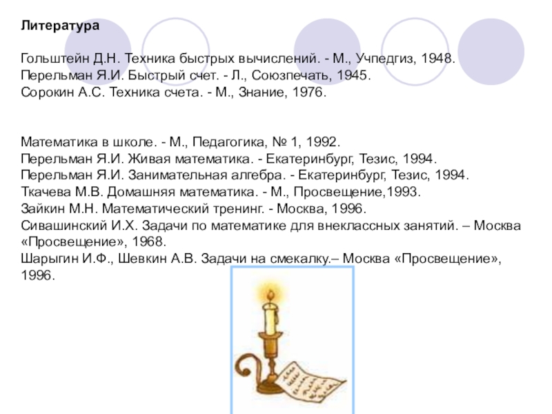 Гольштейн Д.Н. Техника быстрых вычислений. - М., Учпедгиз, 1948.