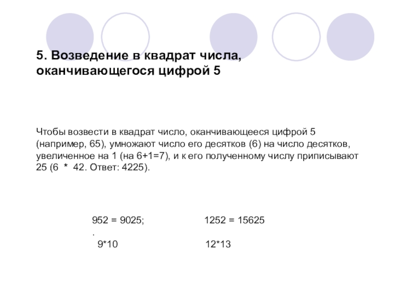 число, оканчивающееся цифрой 5 (например, 65), умножают число его десятков (6) на число десятков, увеличенное на 1 (на 6+1=7), и к его полученному числу приписывают 25 (6 * 42. Ответ: 4225).