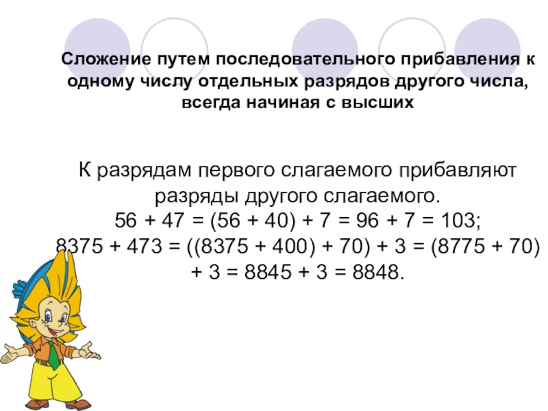 Слайд 6Сложение путем последовательного прибавления к одному числу отдельных разрядов другого числа,
