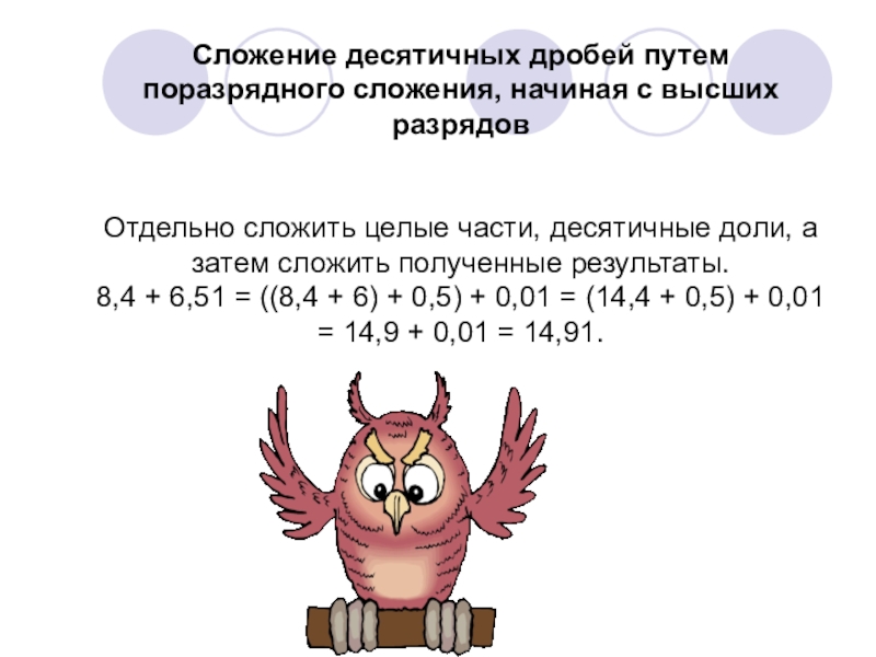 Слайд 9Сложение десятичных дробей путем поразрядного сложения, начиная с высших разрядов