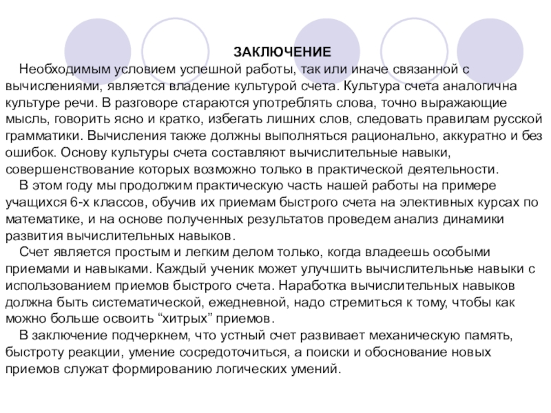 Из выше рассмотренного следует сделать выводы, что вычислительные навыки надо развивать и что развить их может каждый уважающий себя человек, будь то взрослый или ребенок, независимо от его математических способностей, хотя бы, для того чтобы не стать жертвой обмана в нашем сложном мире.