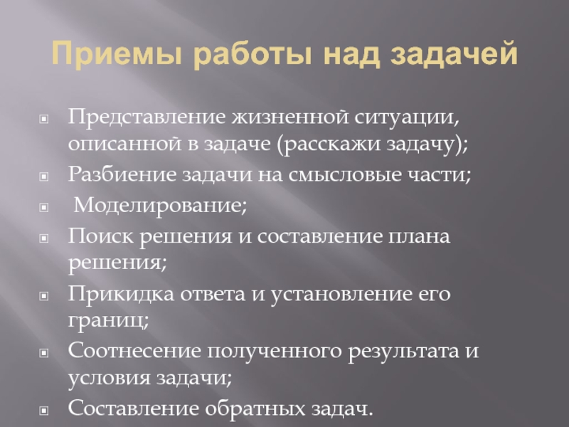 Приемы работы над задачейПредставление жизненной ситуации, описанной в задаче (расскажи задачу);Разбиение задачи на смысловые части; Моделирование;Поиск решения