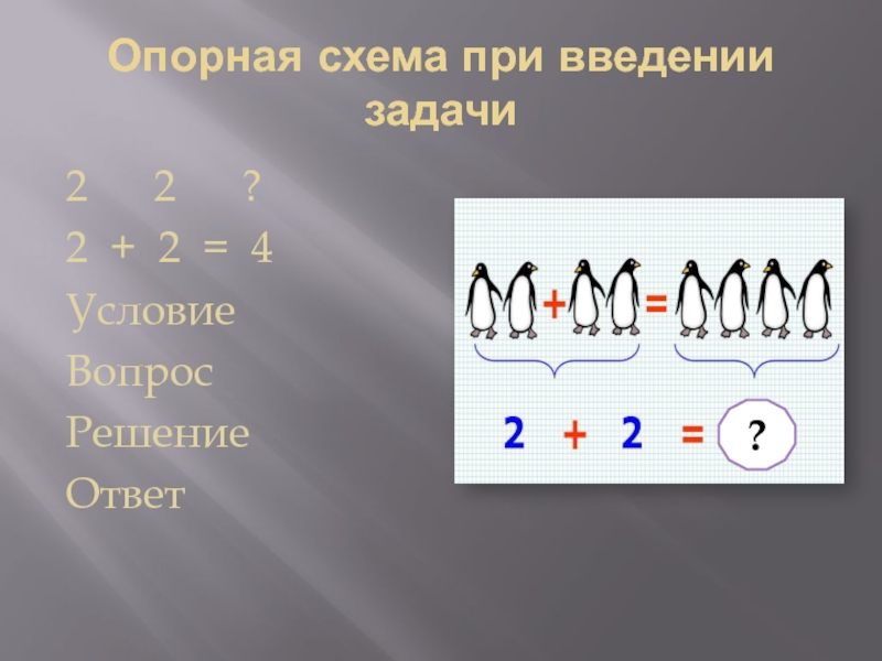 Опорная схема при введении задачи2   2   ?2 + 2 = 4УсловиеВопросРешениеОтвет?