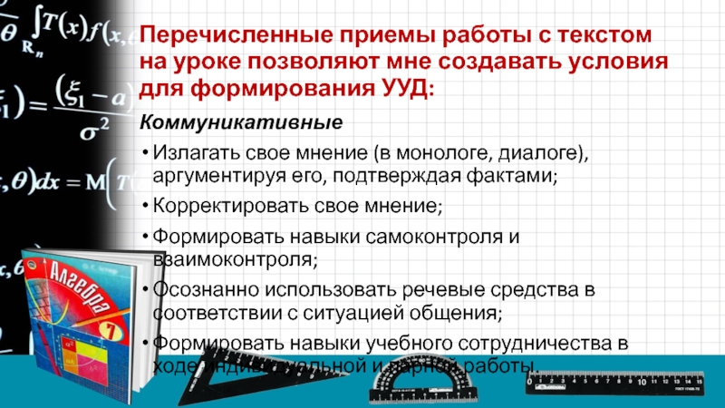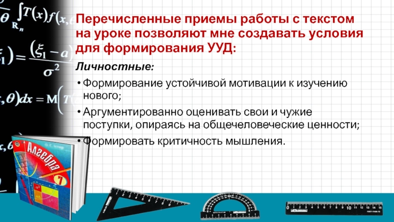 Слайд 27Перечисленные приемы работы с текстом на уроке позволяют мне создавать условия