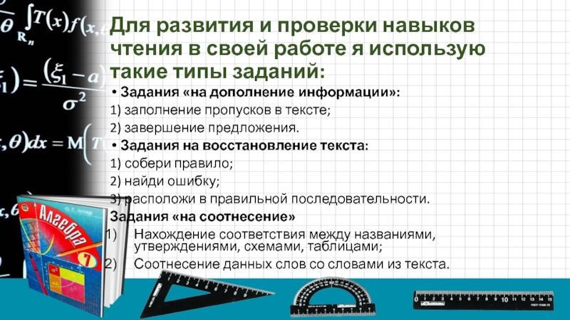 Слайд 24Для развития и проверки навыков чтения в своей работе я использую
